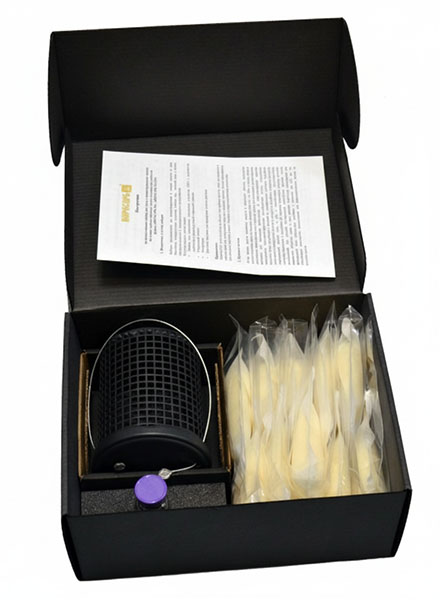 - Набор включает многоразовую погружную камеру — металлическую конструкцию в виде сетчатого цилиндра с крышкой, оборудованную креплением для подвеса и утяжелённым донцем. Такая конструкция обеспечивает надежное положение камеры в потоке воды на заданной оператором глубине погружения. Вес камеры составляет 300 грамм.